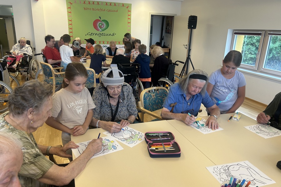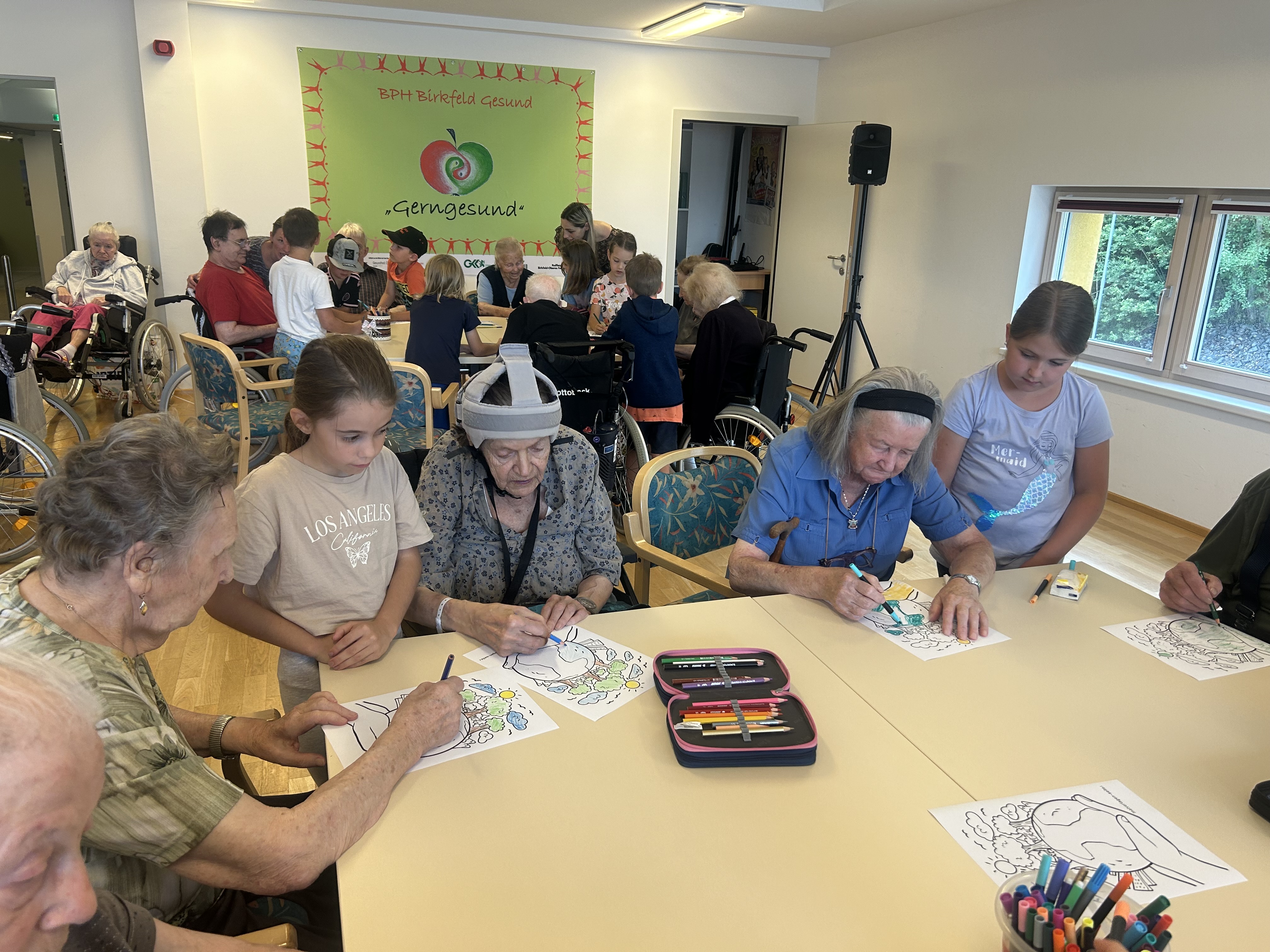 Wie bereits im letzten Schuljahr besuchten die Kinder der Volksschule Baierdorf auch heuer wieder das Bezirkspensionistenheim in Birkfeld. Ziel des Ausflugs war das Zusammenkommen von Jung und Alt. Die Kinder wurden mit Kuchen und Obst herzlich begrüßt, bevor es dann an das gemeinsame Arbeiten ging. Die Bewohner:innen des Pensionistenheims warteten schon gespannt auf die Schüler:innen. Die Kinder hatten zu Beginn etwas zum Lesen vorbereitet, bei dem die Pensionisten gespannt lauschten. Anschließend waren sie dann aber am Zug. Die Schüler:innen erklärten und zeigten vor, was zu tun war, die Bewohner des Hauses setzten dies dann um. Manche machten sich sofort motiviert ans Werk, andere wiederum benötigten etwas Überzeugungsarbeit der Kinder. Schlussendlich konnte den Kindern aber kaum jemand etwas abschlagen und so gestalteten sie gemeinsam ein schönes Werk.