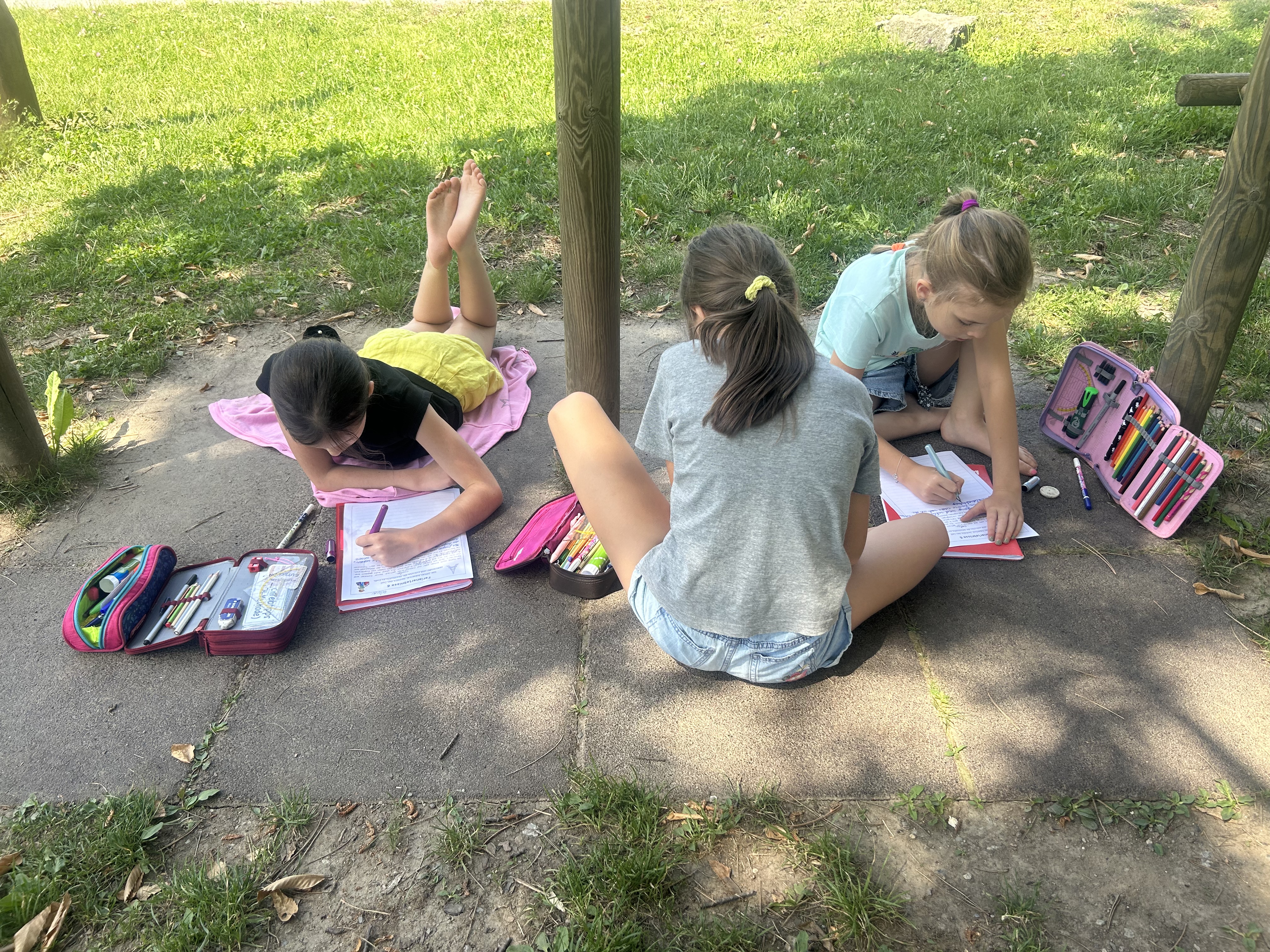 Wir sind froh, so einen großen, vielfältigen und ruhigen Pausenhof zur Verfügung zu haben und hoffen, dass es bis Schulschluss noch viele schöne Sommertage, an denen wir draußen arbeiten können, geben wird.