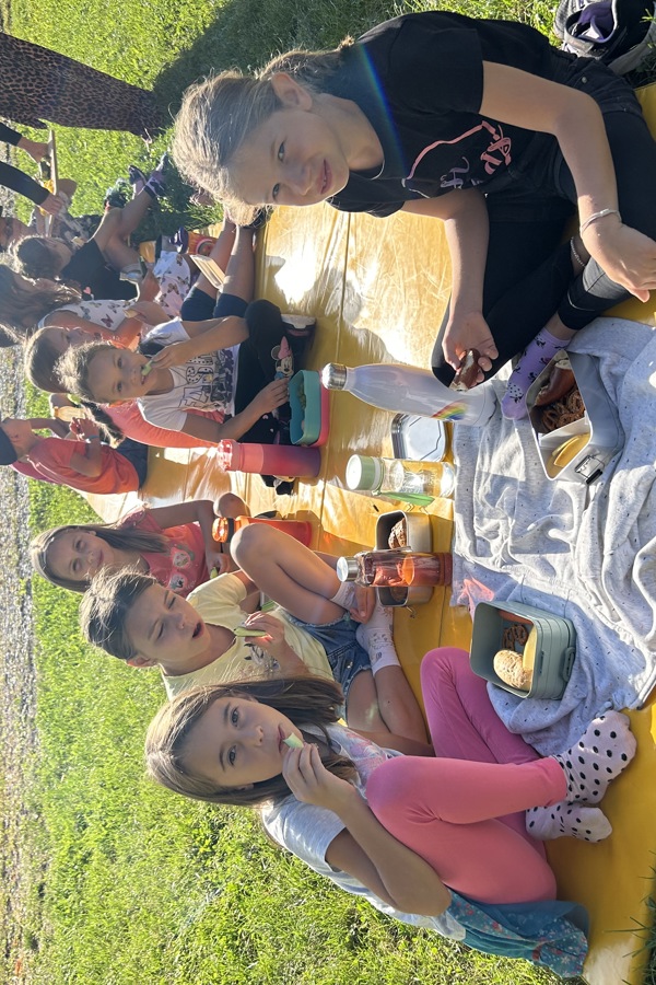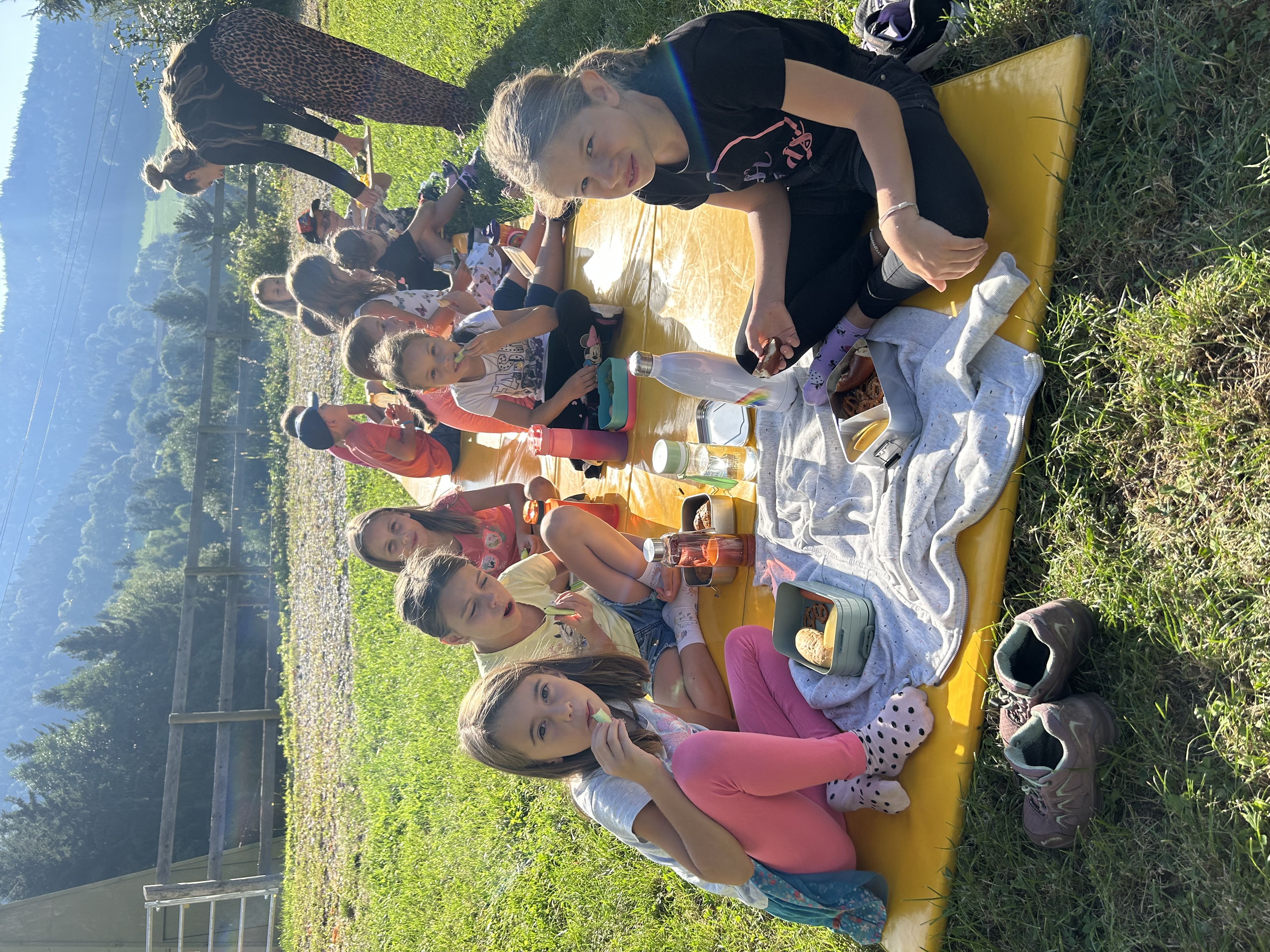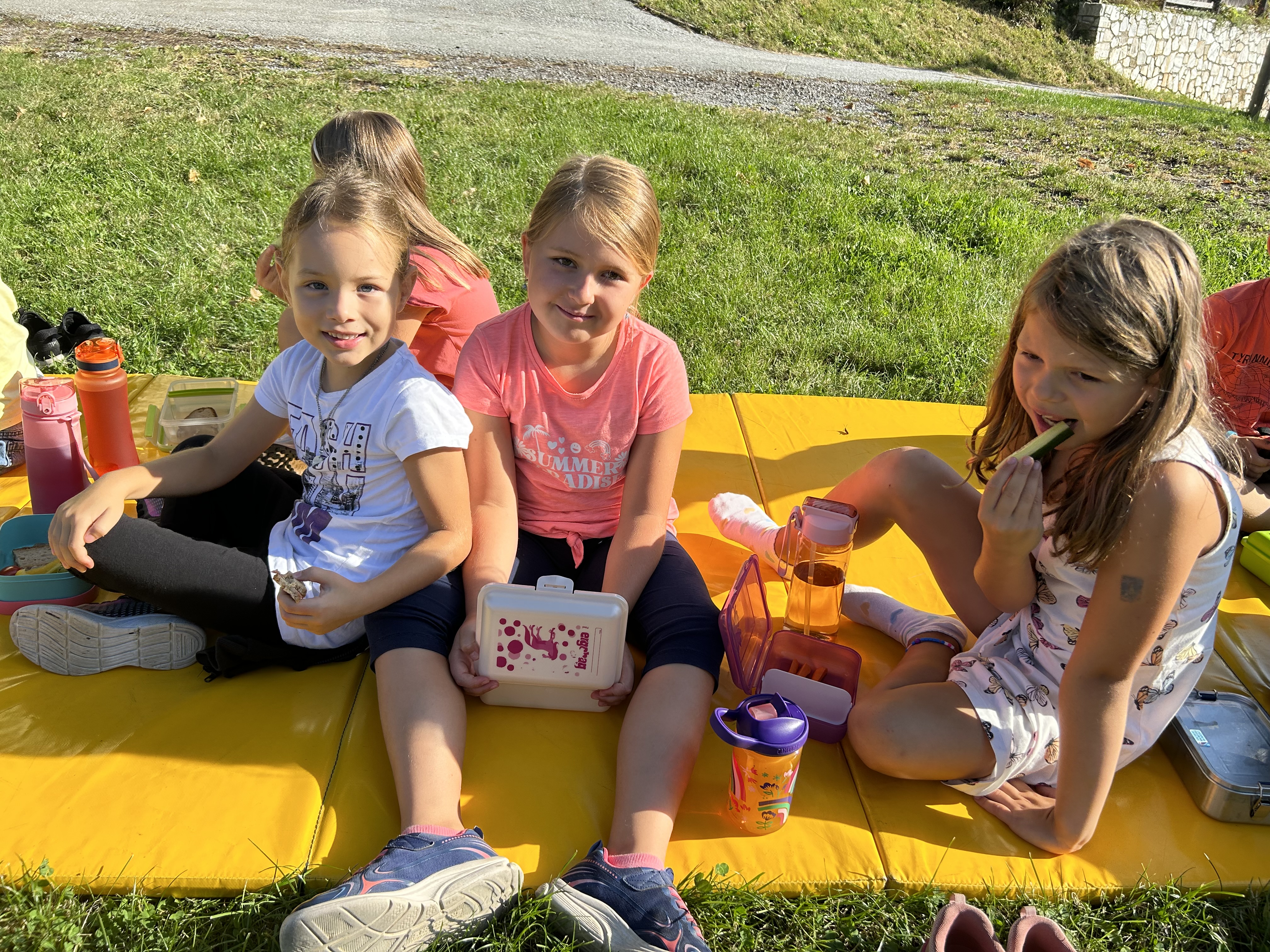 die Kinder gemeinsam mit den Lehrpersonen vor dem Schulhaus ein Picknick in der warmen