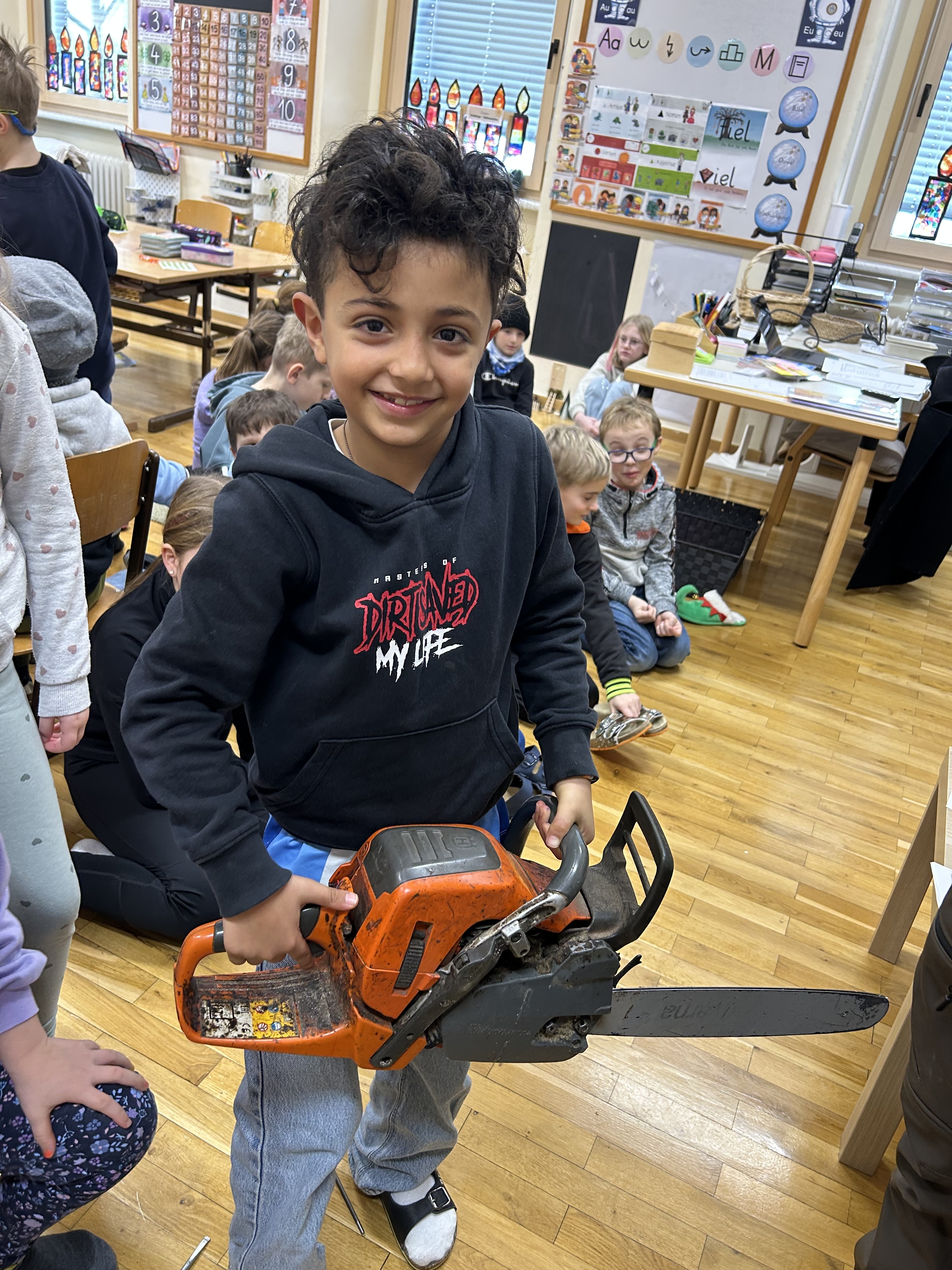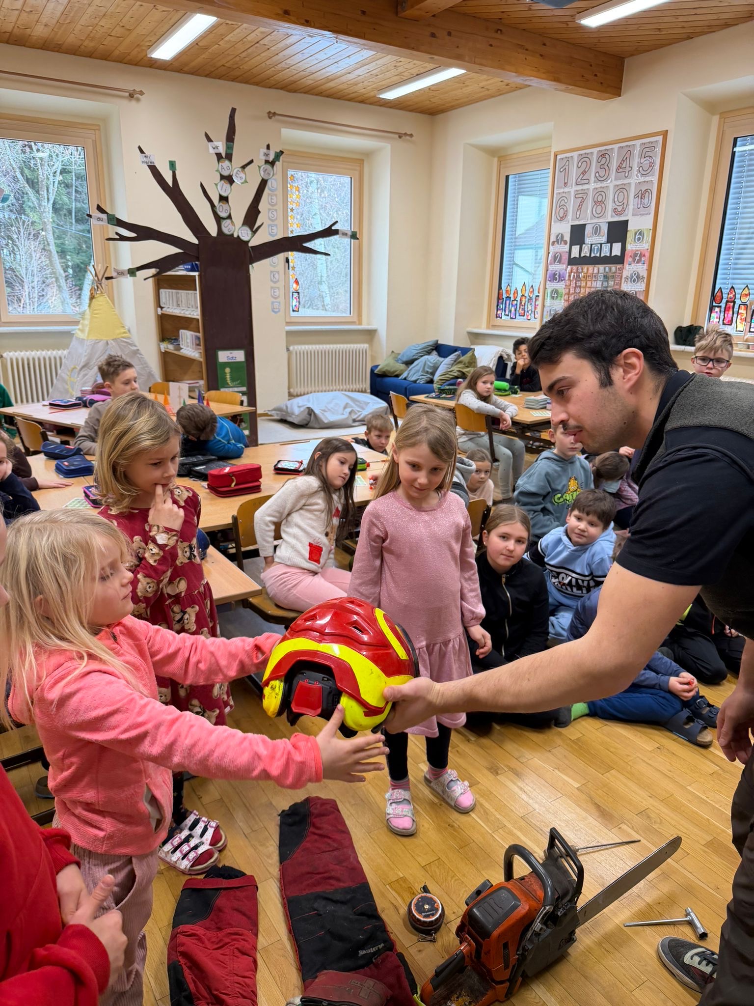 Ein besonderes Highlight war der Besuch eines externen Facharbeiters, der den Kindern spannende Einblicke in das Leben und Arbeiten am Hof sowie in die Holzarbeit im Wald gab.